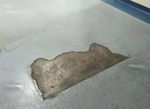 维修方案:如果基层没问题的话,可以直接铺装新地板修补,还可将缺陷部分切出特定造型,既是修补又是拼花。如果基层有问题就需要先修补好基层,再做上边的操作了。