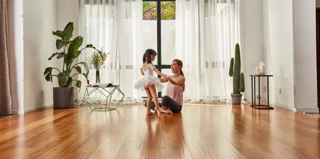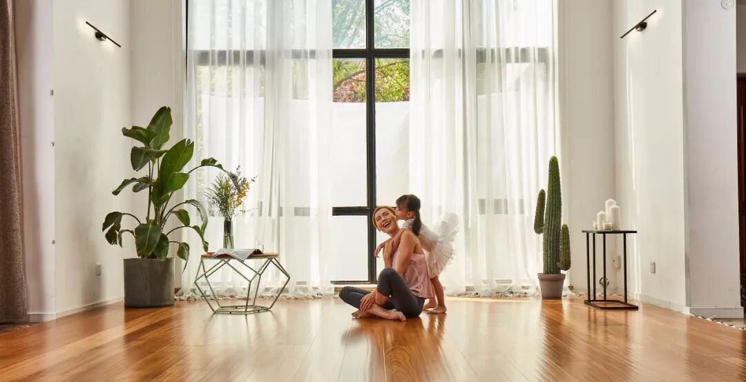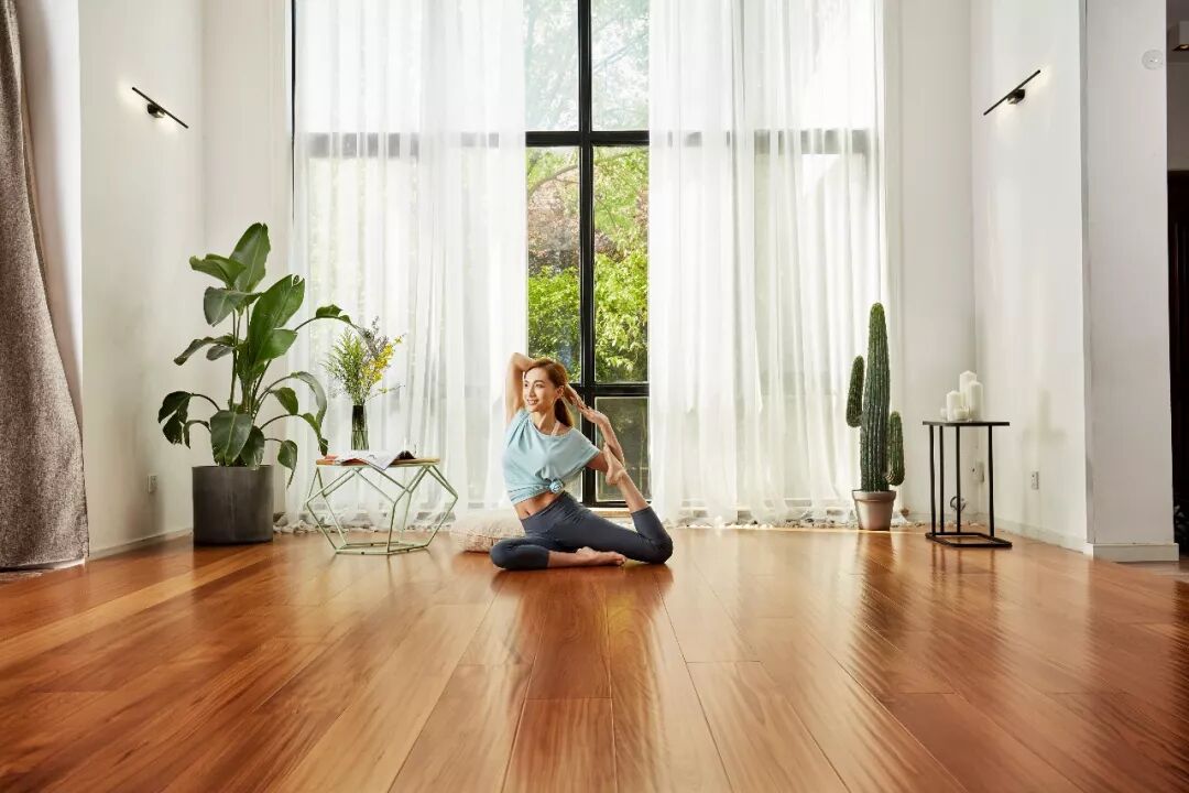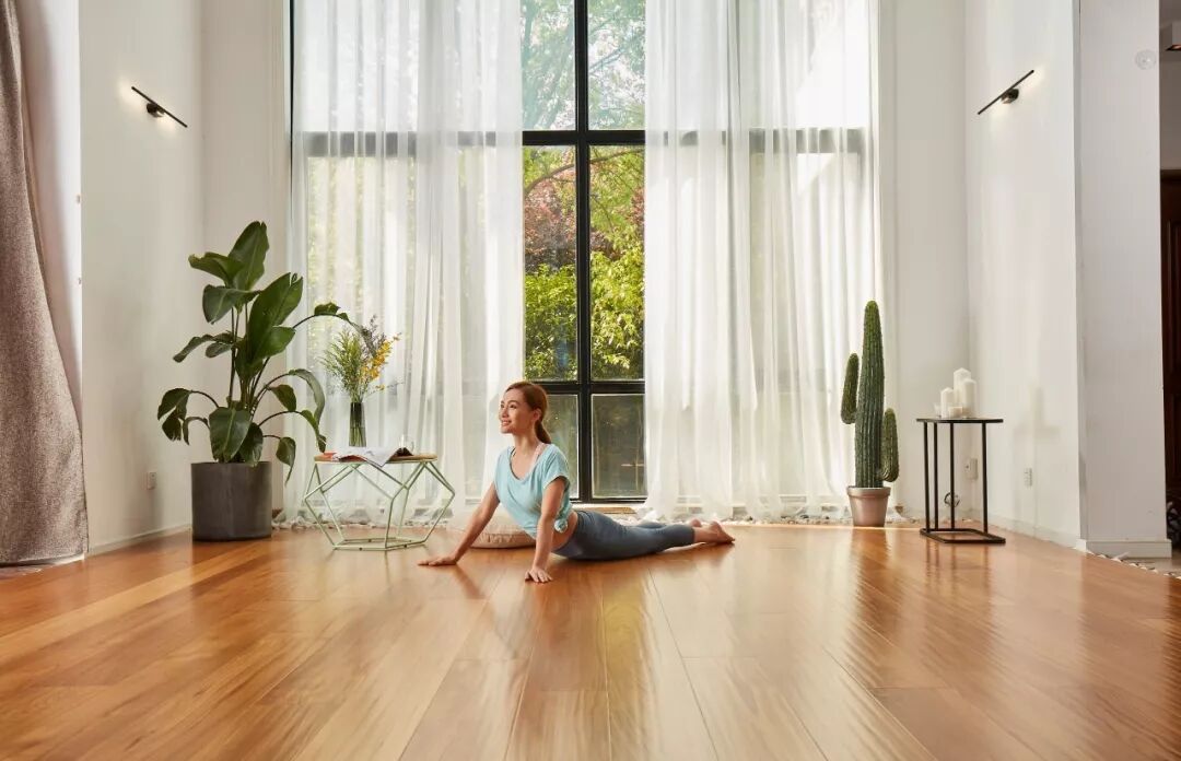 圣象的板面可以最大化客厅的延展度, 让每个人在客厅除了与家人互动之外, 自己在家也可以在客厅安心锻炼活动。 地板和窗外的风景遥相呼应不会显得唐突, 真正让客厅的装修和周围环境融为一体, 从而增加了客厅的舒适程度, 并且让人在瑜伽时能够更加舒适。