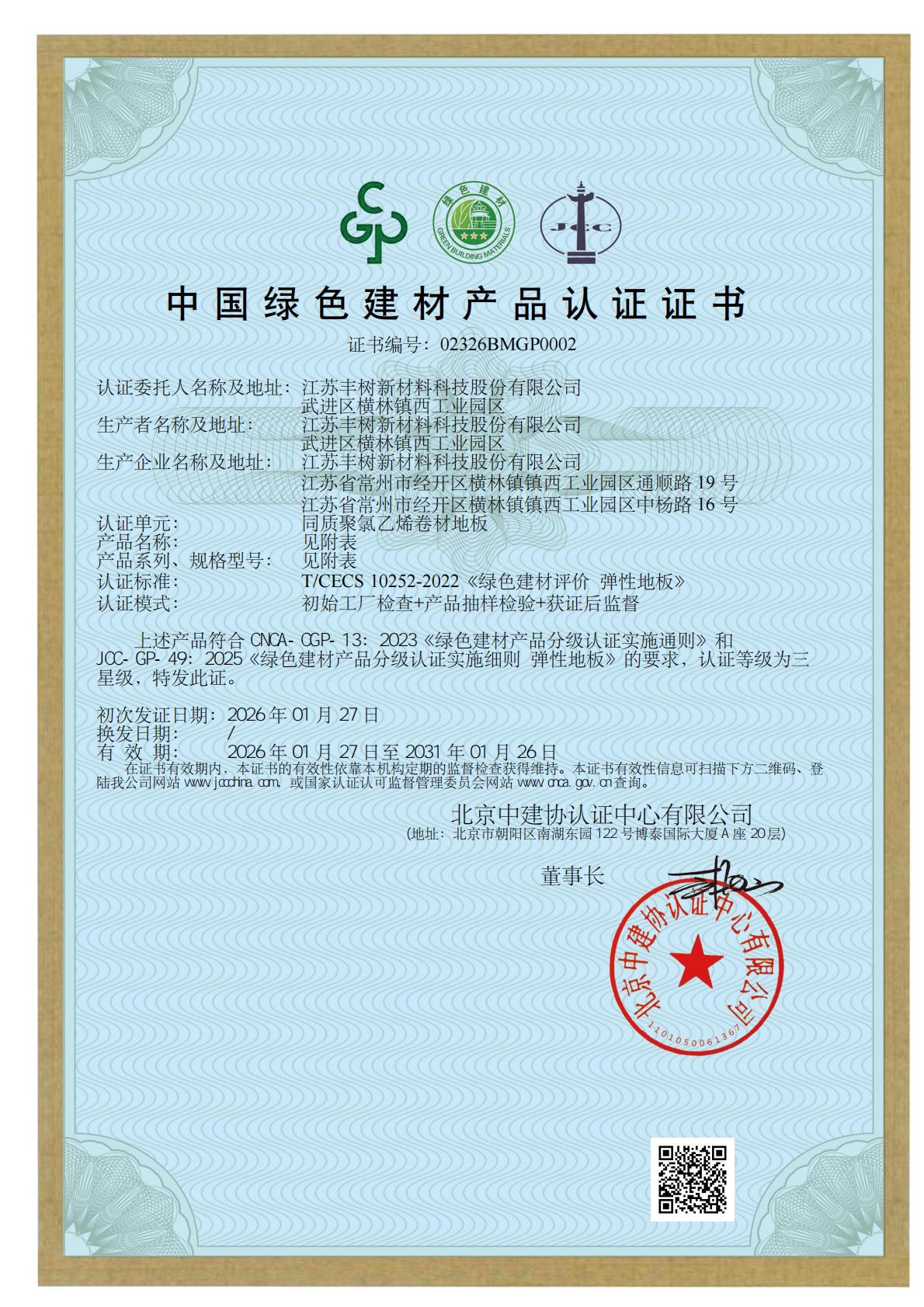 【喜报】江苏丰树新材料科技股份有限公司获得中国绿色建材产品认证