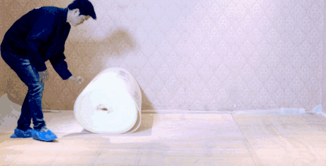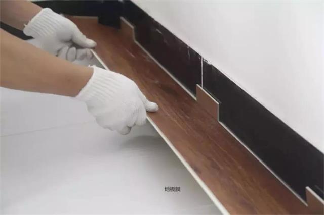 ①铺防潮膜(地膜):先铺2.0mm以上的地膜,膜与膜之间对齐不要重叠,接口用防水粘胶带粘贴密封,四周留5公分余量靠墙;若为实木踢脚线,墙边处需上引50mm以上(最好与踢脚线同等高度)。