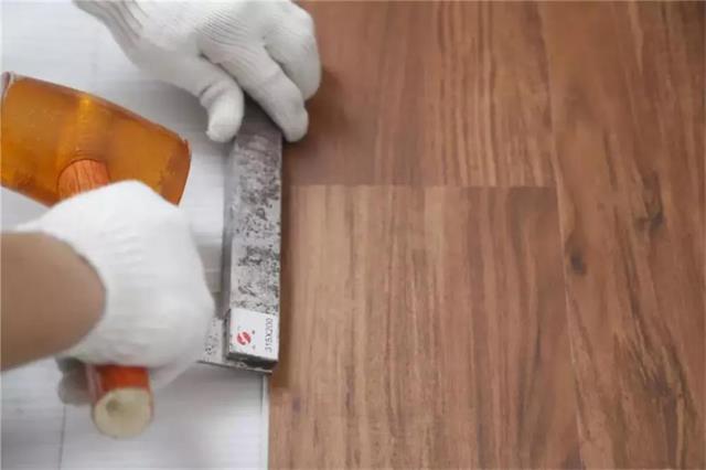 8) 安装最后一排收边时,是用料头拼接还是用整板裁接,应征求用户意见,讲明两种方法的优缺点;安装完毕之后还要来回走动确保地板整体不松动、没有悬空感、踩踏无异响。