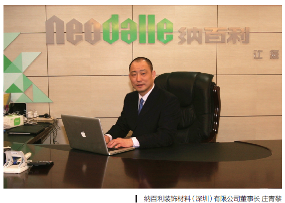 大面积的应用这种材料,其中环保的理念对我的触动特别大。回国后我就做了深入了解,发现 PVC地板行业的潜力在国内还是特别大的,主要应用在工装方面。而国外的一些品牌也有在国 内做代工,所以这也是我建厂的主要原因。时至今日,我觉得PVC地板虽然在国内的地面材料 行业里已经有了自己的一席之地,但家装市场一直是空白,PVC地板以它独特的性能完全可以 适用于家庭装修。在面对消费者市场认知不高的阶段,纳百利采用了国内史无前例的终端店面 展示,目前全国有近200家店面,可以让消费者零距离的接触感受PVC地板,了解到地面材料 可供选择的多样性会为家庭装修带来更多的好处。我预计,未来的3到5年,将会是PVC地板家 装市场发展的高峰期。 Q: 庄董对PVC地板行业充满信心。那么,纳百利公司在PVC地板行业深耕多年,是如何一步 步壮大起来的呢?
