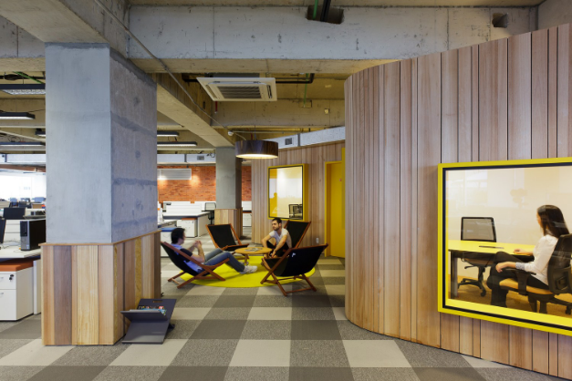 格子地板与向日葵色的搭配,用色大胆又欢快,颇有“小民式”的快乐。 “小民式”的幽默很有法式幽默范儿。小国小民的情怀培养了法国电影中渗透着的无英雄主义,幽默的灵感多来自普通人间的调侃及其生活中所遭遇的尴尬。法国的室内喜剧是完全靠对话衍生出来的,不仅是演员的面部、动作有喜剧效果,台词深入观众的心里面,而且其舞台设计用色大胆、风格浪漫,给人一种喜剧式的欢快感。 弹性地板天生就是“搞花样儿”地材。见缝插针,在工作空间搞点花样儿,张弛有度更能提高工作效率。案例中采用了一种室内剧式的装饰,休闲感的格子地板搭配艳丽的明黄色,再加上房中房的设计,“小民式”幽默的效果一下就出来了:工间休息时坐在一起侃侃天儿,即使独坐房中房,都像在演一幕室内剧。