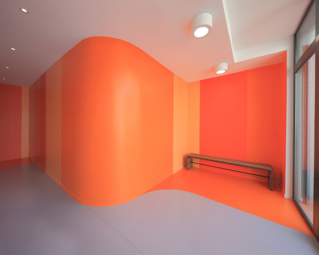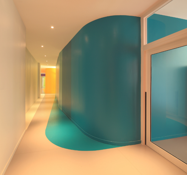 走廊的弹性地板装饰效果,蓝色地面好似“流淌”下来的墙壁。
