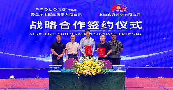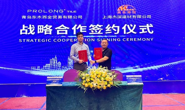青岛东木西金贸易有限公司总经理刘东旭(左一) 上海杰深建材有限公司山东区域销售总监蔡成凯(右一)