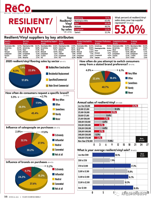 被访者背景: 公司类型: 零售商占85%,承包商12.2%,家居中心1.7%,家具商店1.1% 地板年销售额:($) 大于100万占25.5% 100-200万25.4% 200-300万12.5% 300-500万15.5% 500-1000万美金13.5% 1000万美金以上12.6% 销售地板的类型: 地毯占30.2%,乙烯基/弹性地板8.4%,复合地板5.8%,天然石板2.2%,块毯3%,硬木11%,LVT/多层地板24.7%,瓷砖10.3%,窗帘1.4%,橱柜3% 平均每周有多少客户在店面购买地板? 大于5个占17.3%,6-10个18.9%,11-20个25.3%,21-30个13.1%,31-50个11.3%,51-100个8.3%,101-300个4.1%,300以上1.7% 2020年增长最快的部分: 重置房产占69.7%,新房18.5%,写字楼7.6%,商业4.2% 有多少个地板供货商? 8个以上占58.7%,7-8个13.8%,5-6个18.3%,3-4个7.1%,1-2个2.1% 地板销售额在各市场的占比: 重置房产占53.9%,新房23.8%,写字楼12.5%,商业9.8%