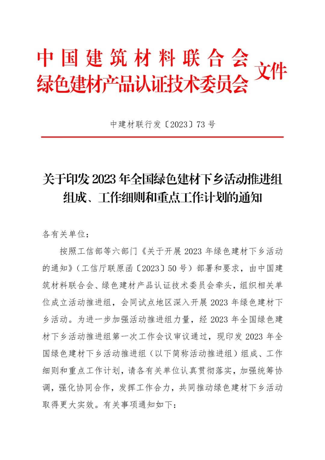 近日,根据工信厅联原函〔2023〕50号文件的部署和要求,中国建筑材料联合会和绿色建材产品认证技术委员会将牵头组织相关单位成立活动推进组,负责组织和推动2023年全国绿色建材下乡活动的实施工作。