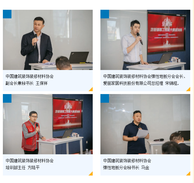 大会开始中国建筑装饰装修材料协会副会长兼秘书长王保祥、中国建筑装饰装修材料协会弹性地板分会会长、爱丽家居科技股份有限公司总经理宋锦程、中国建筑装饰装修材料协会培训部主任方陆平、中国建筑装饰装修材料协会弹性地板分会秘书长马金、参赛选手代表、裁判员代表分别致辞,对参赛队伍致以深切的厚望及殷切的嘱托,并预祝大赛取得圆满成功。