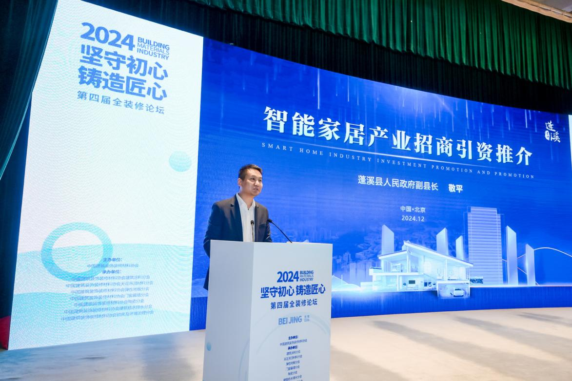 大会以“坚守初心·铸造匠心”为主题,汇聚国内建筑装饰装修材料行业多个领域,涵盖弹性地板墙板、建筑给水排水、天花吊顶、遮阳、门窗、涂料等领域的龙头企业、行业先锋和顶尖专家,旨在通过搭建一个高效的交流与合作平台,促进产业链上下游企业的深度融合,加速新技术、新材料、新工艺的推广应用,为建材行业注入全新活力。来自建筑材料各领域的领军企业和专家代表,围绕行业热点难点问题,展开了多场精彩纷呈的主题演讲和圆桌论坛,分享了最新的研究成果、市场趋势及成功案例,为参会者带来了丰富的知识盛宴和灵感碰撞。 蓬溪县人民政府副县长敬平做了《智能家居产业招商引资推介》的报告。