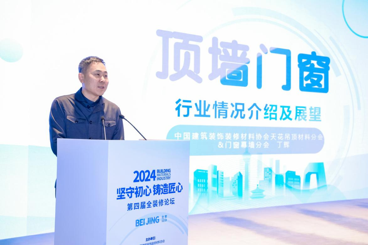 天花吊顶材料分会、门窗幕墙分会秘书长丁辉做了《顶墙门窗行业情况介绍及展望》的精彩演讲。