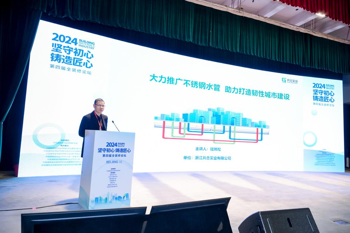 浙江共合实业有限公司董事长陆姚松做了题为《大力推广不锈钢水管 助力好房子建设》的主题演讲。