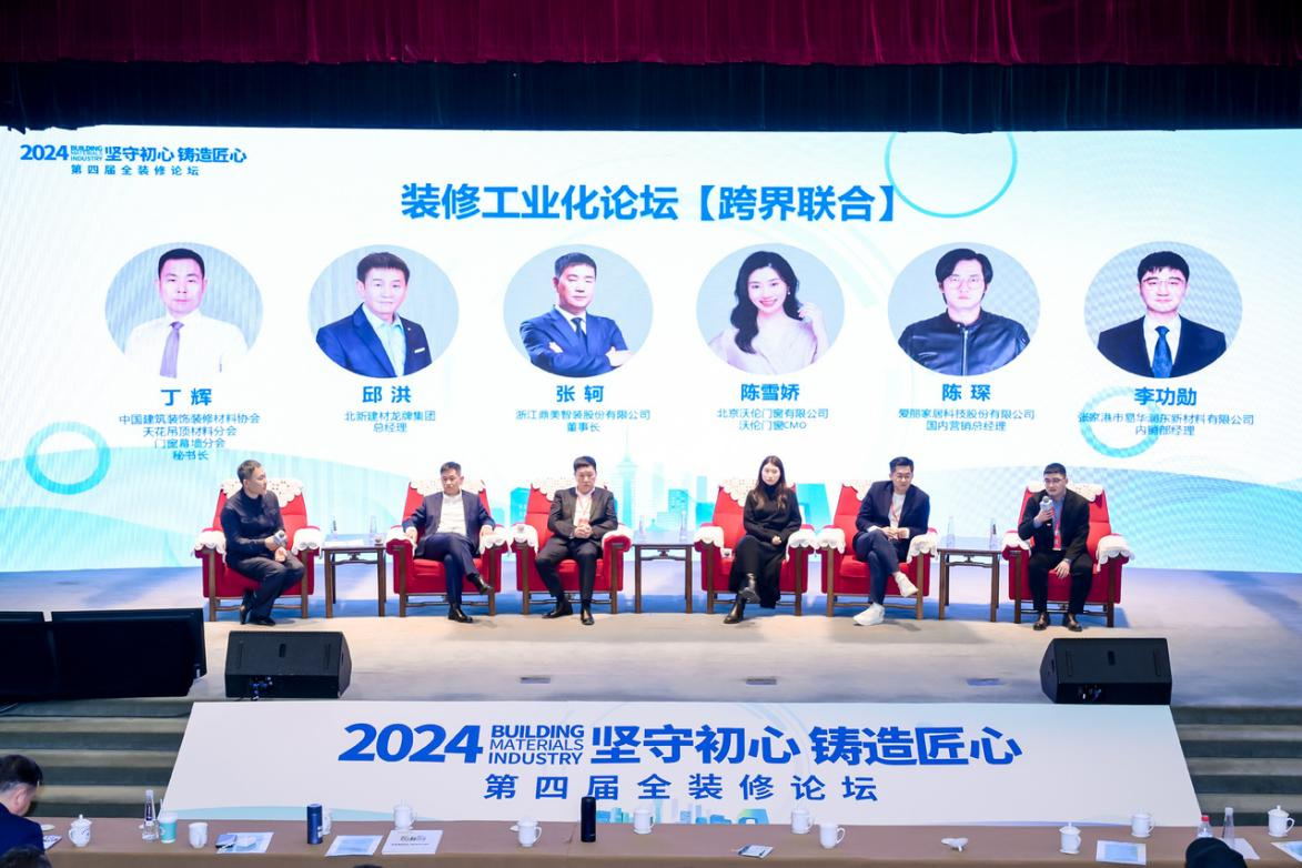 在聚焦于装修材料跨界融合与创新发展的装修工业化论坛【跨界联合】环节,论坛由天花吊顶材料分会秘书长丁辉主持,与论坛嘉宾北新建材龙牌集团总经理邱洪、浙江鼎美智装股份有限公司董事长张轲、北京沃伦门窗有限公司沃伦门窗CMO陈雪娇、爱丽家居科技股份有限公司国内营销总经理陈琛、张家港市易华润东新材料有限公司内销部经理李功勋围绕装修材料行业的跨界融合与创新发展进行了深入交流。他们一致认为,跨界合作是推动装修材料行业高质量发展的关键路径,通过跨界合作,不仅可以实现资源共享和优势互补,还能激发行业创新活力,推动产业升级和转型。