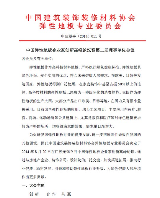 中国弹性地板企业家创新高峰论坛暨第二届理事单位会议
