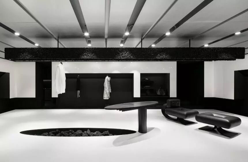 墙面运用“小心机”,设计为黑白相间之外,还运用两色比例的微妙变化,展现灵活的用色技巧,彰显设计感。 除此之外,带状的装饰条代替了沉闷的吊顶,光源嵌于其中,让人联想到宇宙里的星球分布,极具浪漫色彩。 地面更是别有洞天,借助弹性地板易于裁切的优势,在白色的地面上特别挖出一块种上植物,地面景观与墙顶部的绿植带呼应,禁欲系的空间内幽幽散发自然气息。