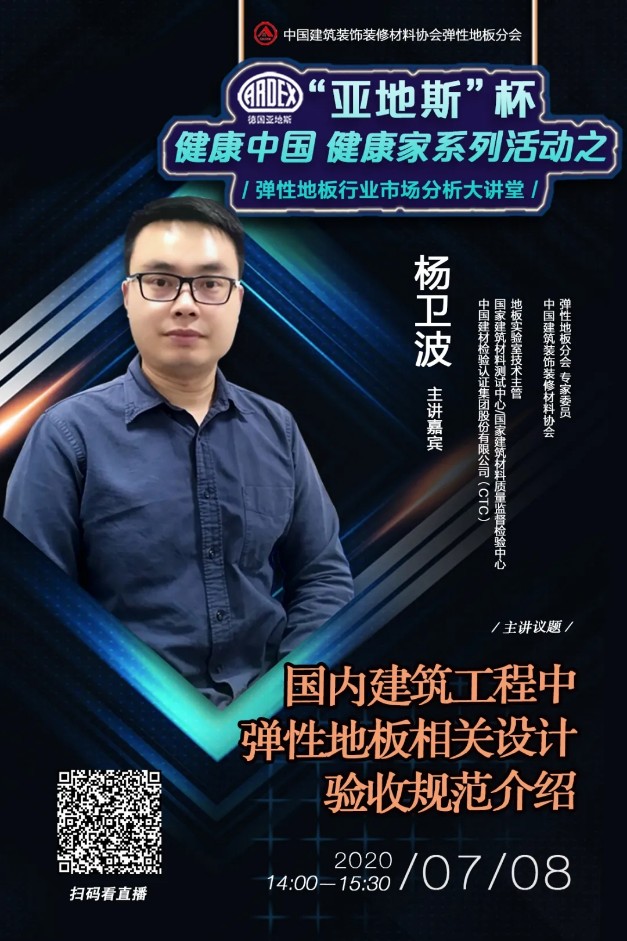 “亚地斯”杯 健康中国之弹性地板行业大讲堂第五讲来喽,欢迎扫描图中的二维码进来观看现场直播! 本期主题:国内建筑工程中弹性地板相关设计、验收规范介绍 演讲嘉宾:中装材弹性地板分会专家委员、中国建材检验认证集团股份有限公司(CTC)、国家建筑材料测试中心/国家建筑材料质量监督检验中心 地板实验室技术主管杨卫波 直播时间:2020年7月8日下午14:00-15:30