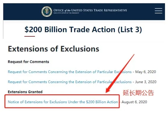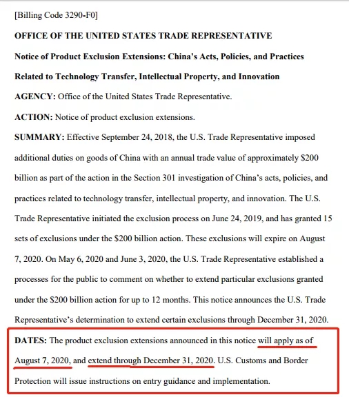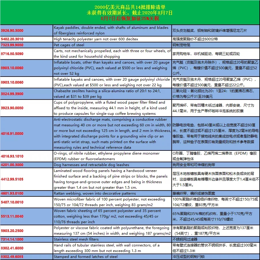 8月6日,美贸易代表办公室(USTR)公布了针对2000亿美元(自2018年9月24日开征)中国产品加征关税(List 3)中的共14批排除清单加征有效期(2020年8月7日到期)延长公告;本次获得延长清单共涉及190个税号266项产品:其中21个税号下所有商品和169和税号下部分商品延长至2020年12月31日;未获得有效期延长的共涉及441个税号下727项产品;这727项产品8月7日起恢复加征25%关税。 加征有效期延长的公告 2000亿美元关税清单自2018年9月24日开始执行,加征税率为10%;2019年5月10起加征税率为25%;并于2019年8月7日做第一次排除,截止目前共排除14批;这14批排除清单有效期原定于2020年8月7日到期。本次公告决定,将266项商品的排除有效期延长至2020年12月31日,727品项商品8月7日起恢复加征25%关税。