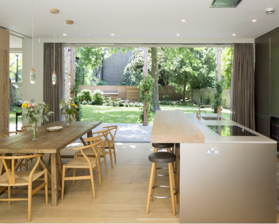 这组餐厨空间案例,对热爱生活的人而言,有着特殊的吸引力。 木纹弹性地板通过开放式的空间设计,自然清新地完成了室内与户外的连接,构建出亲和力十足的户外感餐厅。 我们喜欢它的理由:这仿佛就是美好生活该有的样子——逃离都市的喧嚣,与家人一起享受美妙的就餐时光,唇齿间美味在流转,眼里是清新的家与窗外的绿,脚下是柔软舒适的弹性地板,满心都是平淡的幸福与深深的欢喜。 光与影 天然亲和力 光是户外的活力之源,借着树叶在餐厅投射出自然的影,灵动的影瞬间激活了朴素的餐厨空间。 户外的阳光是室内无法企及的,打破厚重的墙,让阳光得以照射进餐厅,弥补了室内光线不足的缺陷,如此一来餐厨空间仿若置于户外,室内空气亦变得流通舒畅。不过这样的设计容易出现阳光暴晒的情况,相当考验窗前地板的耐晒性与稳定性。