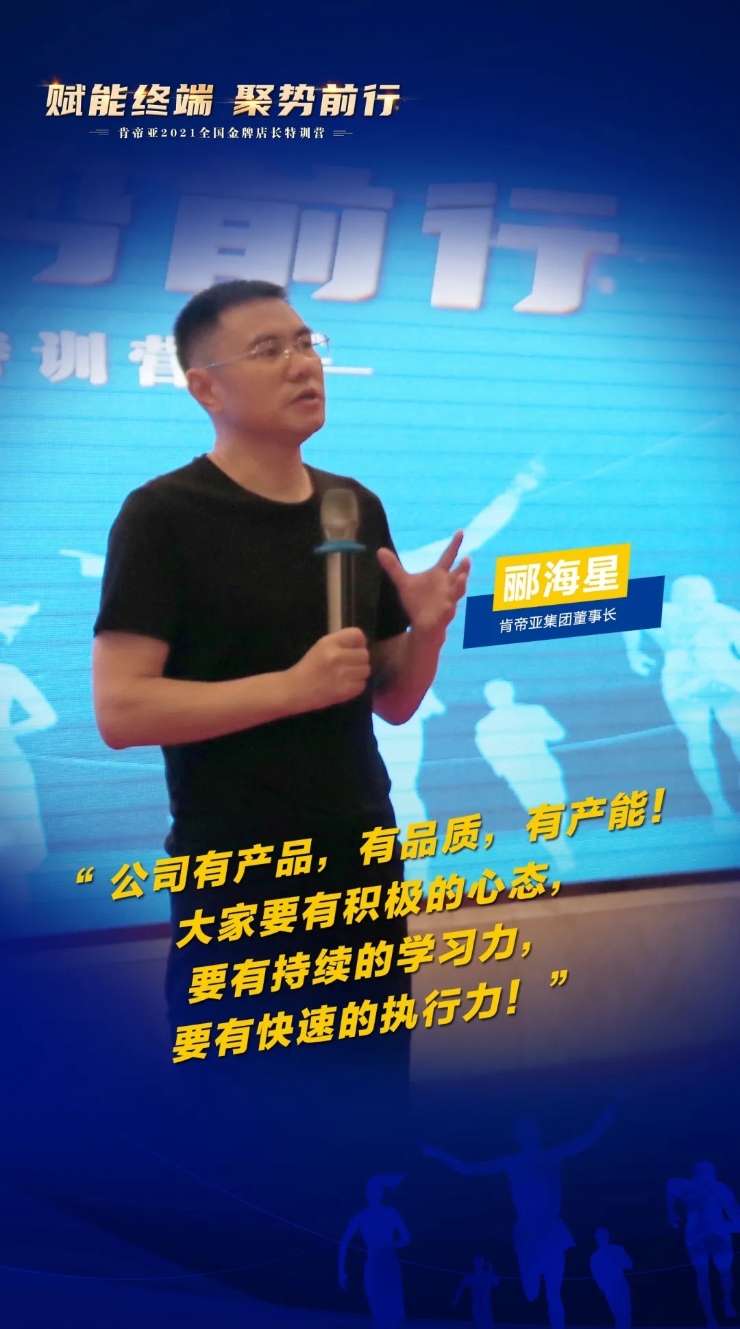 5月20日,在这个特殊的的日子里,肯帝亚集团董事长郦海星先生亲自莅临现场,向金牌店长学员们深情“表白”。郦董的一句表白问候,瞬间点燃了全场金牌店长们的热情,郦董表示公司有产品、有品质、有产能,大家要有积极的心态、要有持续的学习力、要有快速的执行力!