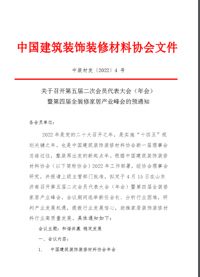 1.中国建筑装饰装修材料协会年会 1)五届二次会员代表大会 2)五届二次理事会 3)五届三次常务理事会 4)五届三次监事会