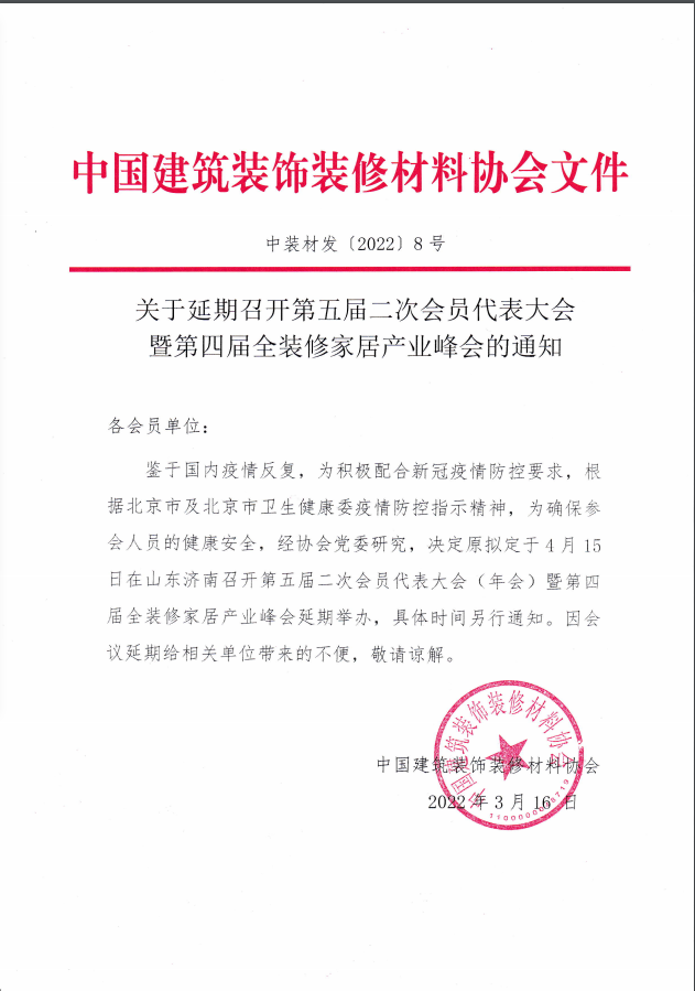 关于延期召开第五届二次会员代表大会暨第四届全装修家居产业峰会得通知!