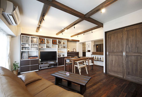 深色调地板的感染力和表现力强,个性牲鲜明。如红色调的地板本身颜色就给人强烈的感觉,再将墙壁也选用深色调涂刷,就会产生压抑不和谐的感觉。如果选择带有粉色调的象牙色,与红茶色地板会形成统一感。