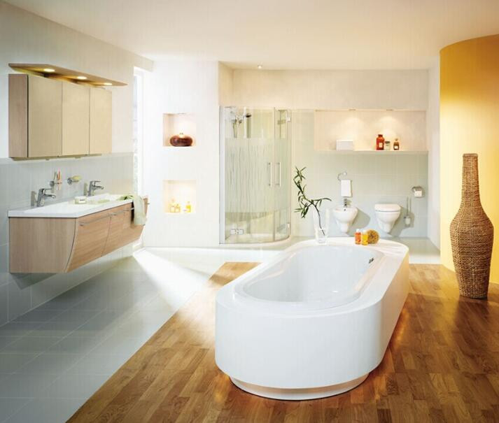 局促的浴室面积,让地板施工变得不太容易,地面效果也不太容易掌握。还好有PVC地板,其安装施工非常快捷,不用水泥砂浆,地面条件好的,直接用专用环保地板胶黏合即可,24小时后就可以使用。PVC卷材和PVC片材,还可以根据空间的特殊需要来进行切割和拼接。