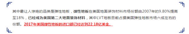 根据今年世界地板大会现场,中国林产工业协会吕斌理事长的报告,2018年,中国地板年总产销量约8.9亿㎡,其中,木竹地板约5亿㎡,SPC、PVC地板约3.6亿㎡,与2017年同比增长8.5%,其中3.5亿㎡出口。木塑地板约3000万㎡ 。弹性地板在美国市场大热的原因是: