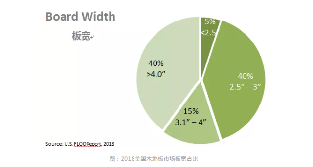 2018年美国硬木地板行业的经济产出超过87亿美元。美国木地板有三种规格,分别是镶木地板parquet, 细条地板strip 和宽幅地板plank。按产品宽度计算美国木地板总销售额,细条地板Strip约占美国木地板市场的45%,而宽幅地板Plank地板约占市场的55%。这里需要强调的是,对板宽超过4英寸的木地板需求正在增长。现在认为6到8英寸的宽度是常见的,未来可见的地板发展趋势将是更宽更长。