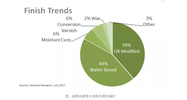 美国消费者偏向喜欢带有自然特征的地材产品,就木材而言,这包括诸如结孔,矿物条纹和自然颜色变化之类的东西。在过去几十年中,这些自然生长特征被认为是不合需要,而在今天恰恰相反,木材产品是根据其天然生长特征进行选择的,这些自然特征是无法复制的。如今,木地板饰面的偏好也发生了变化。美国消费者对于光泽较少的饰面有明确的偏好,因此天然油和哑光水性饰面是最受欢迎的选择。