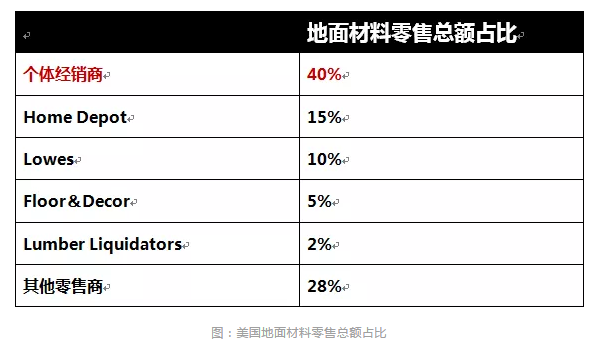 美国地面材料的个体经销商占据40%销售份额,将近10000家地面材料个体经销商,共拥有15000家店面;除此之外,还有一些是线上销售等其它零售渠道。
