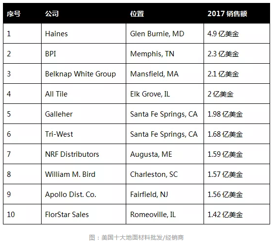 主要是通过批发商/中间商Distributors和代理机构Agents来完成;美国十大地面材料批发/经销商如下: