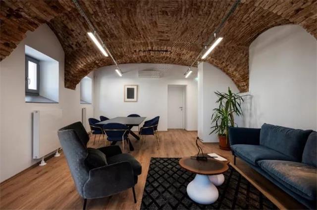 这是一座旧谷仓改建的办公休息区。木纹地板恰到好处地呼应了原木穹顶的古老气息,暗旧的色泽突出了一种被时间洗礼过的宁静,纪念过往的念旧回味让办公休憩区的静谧多了一些韵味。