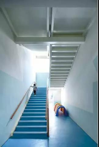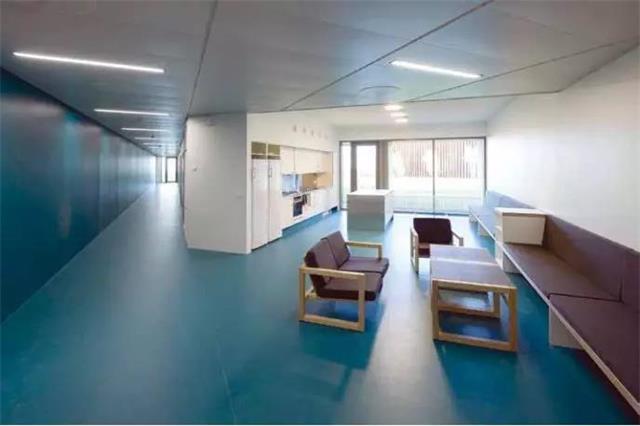 ![]() 在医疗空间内,患者的焦虑可以通过色彩得以缓解, 蓝色是是大海与天空的颜色,给人平和、恬静、高远之感,起到安抚焦虑情绪的作用。除此以外,弹性地板超强的防滑性与抗冲击性,还能在楼梯及过道等公共活动空间有效保障患者的人身安全。 图. 楼梯踏步选用安全性能高的弹性地板,