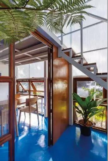 图. 海洋风的蓝色系地板与绿色的植物搭配,