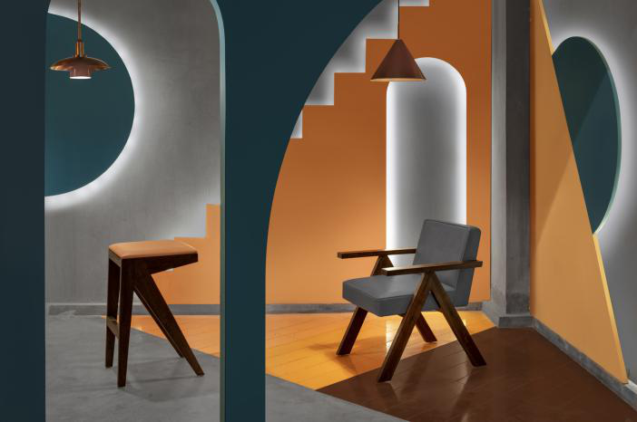 花边、拼色等装饰元素本就带有强烈的游戏感,两个三角形拼成一个大三角形,再与墙体连成立面三角形,简直就像一群埃及神仙鱼,优哉游哉,欢快热闹。这样的地面装饰太适合休闲空间了,坐在这里喝茶喝咖啡,看书聊天,氛围惬意轻松。