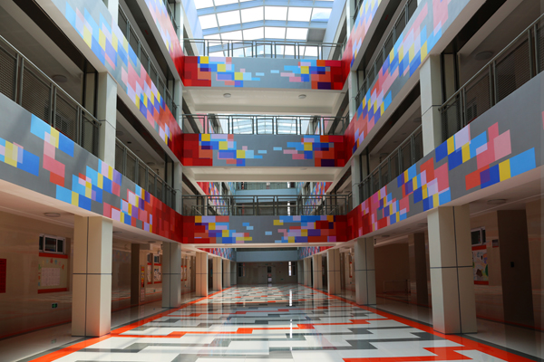 弹性地板天然的花纹效果逼真,通过设计师的风格理念,还可定制成任意图案,无数酒店都将大自然搬进了房间,给人以天人合一的视觉体验。 特别是,弹性地板真的像大自然一样,给环境宁静体验,其材质吸音防噪的优势,让酒店萌生静娴的安宁气氛。 图形图案定制后的弹性地板铺在场馆 公共空间的视觉大气美观,目的是要为顾客提供一个轻松、明快、安静的公共环境,一个可休息、可停留、可聚会,亦可独处的无菌场所。 弹性地板可将基本的休息设施承载其上,比如异形座椅,以及适当的餐区、珠宝展柜等设施。公共空间时常会举办一些公共活动,如舞蹈演出、时装表演、艺术展览会以及节日庆典等,被精心铺装的弹性地板,其防噪音、吸音、静音的优势是即刻被选用的制胜宝典。