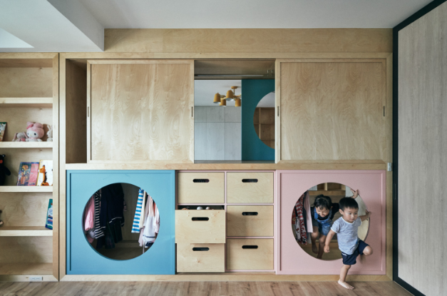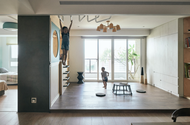 森林之于孩子,等同于纯真的童话世界,没有一个孩子能抗拒这种神秘的吸引力,他们有的自认为是森林之王狮子,有的自认为是霸气的老虎,也有人自认为是可爱的兔子……并在现实生活中模仿演绎各种动物,上演自然动物世界。 利用弹性地板可上墙装饰及易于裁切的优势,在墙板上进行镂空裁切,让孩子们可以自由穿过墙面,仿若在丛林中不断穿越荆棘、向前迈进。木纹弹性地板具有浓浓的自然气息,超强的自然氛围及代入感,“神兽”们在此得以释放爱玩天性。 “神兽”行动之高空攀爬