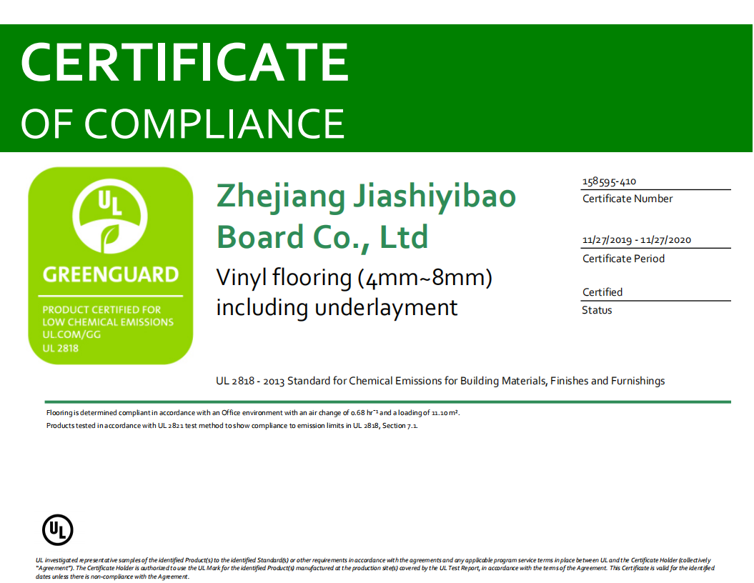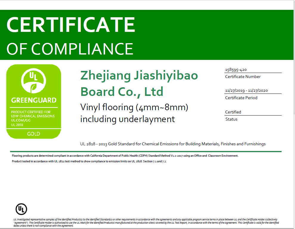 人和集团是一家以生产化学建材和PVC地板及其配件等环保类产品为主导的大型企业,是目前全球大规模化学建材生产基地之一,被国家建设部授予了“中华人民共和国建设部化学建材产业化基地”的称号。浙江佳适逸宝板材有限公司,是人和集团旗下的全资子公司,集研发、生产、销售、施工为一体的专业弹性地板综合服务集成商。 优势: 工厂规模—浙江佳适逸宝板材有限公司工厂规模大,拥有现代化的标准厂房,现代化的管理体制,生产设备先进,产品种类多、品种齐全,供货时间快; 品牌声誉—品牌影响力处于国产品牌领先地位,已进入海外市场,中国弹性地板十大品牌; 服务能力—售前、售中、售后有专业队伍服务于客户。具备完善的服务保证措施,产品供货期保证措施及售后服务计划。 技术实力: 公司通过整套引进国外先进设备,研制独有配方和工艺,再加上建立起了完善的质量管理体系,使产品质量达到了全国一流水平。目前,拥有当前国内最完备的化学建材产品研发机构——化学建材研究院,拥有企业博士后科研工作站,有效的保证了产品在技术、质量和新产品开发领域始终处于行业领先地位。公司自成立以来,始终坚持以科技为先导,以市场为导向,注重科技投入,提高企业自主创新能力,加快企业快速发展。积极与国内各大院校及科研机构进行研发合作,聘请国内外专家对产品进行技术研讨等,建立起产学研相结合的自主创新平台,为公司培养了一大批高技术专业人才,极大地增强了企业发展与公司的创新能力,促进公司新产品、新技术、新工艺的日益生成。公司产品主要有:SPC环保地板,WPC环保地板,硬质LVT地板,PVC同质透心卷材、踢脚线、PVC发泡型墙板及户外木塑地板等产品,产品生产供应的实力,都远远优于同行。 资质介绍: 2019年,欧盟CE认证 2019年,通过REACH检测 2018年,ISO 9001质量体系认证 2019年,通过法国VOC检测 2019年,美国GREENGUARD认证 2019年,美国FLOORSCORE认证 2019年,防火检测报告:难燃b1级 《硬质聚氯乙烯低发泡地板》国家行业标准第一主编单位。 浙江佳适逸宝板材有限公司,年产能2000万平方米/年,园区规划31条挤出生产线、6条UV线、4条分切线、6条开槽线、8条背贴线、4条包装线,公司占地面积 650000平方米(近1000亩土地 ),园区建筑总面积350000平方米。 工厂图片及生产线图片