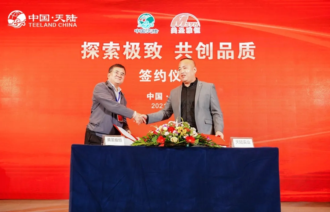 会上针对经销商天陆实业打造了一套全新的优势政策,以产品和市场为基础,以客户体验为核心,打造一套客户服务体系,公司将更加重视通过服务来给产品带来的溢价。为了实现公司的整体发展战略目标,公司专门成立了市场部、商务部、设计部、产品部,更加专业的为客户提供售前服务,还有工程部、售后部为客户提供更及时的售后服务。 现场群英荟萃,对于天陆来说,优秀的经销商既是一起感受阳光雨露的伙伴,彼此在奔赴前程中给予动力与支持,更是品牌发展最重要的隐形宝藏。与会人员不时提出市场见解和相关产品技术问题作共同探讨,会场中气氛活跃,大家踊跃发言,经销商们各种真知灼见不时掀起一个个热潮,交流会后非常感谢天陆实业有限公司搭建的这种厂商互动交流平台。 推介会末段,天陆实业肖总和美圣雅恒马总上台进行签约仪式,达成了战略合作联盟,为双方合作双赢、共谋发展拉开了崭新的序幕。