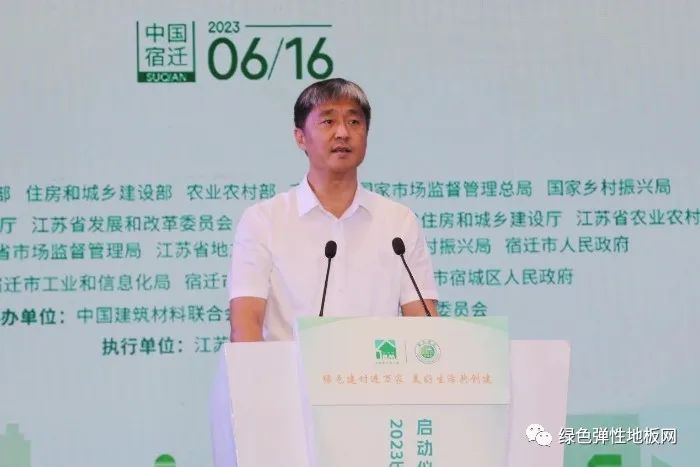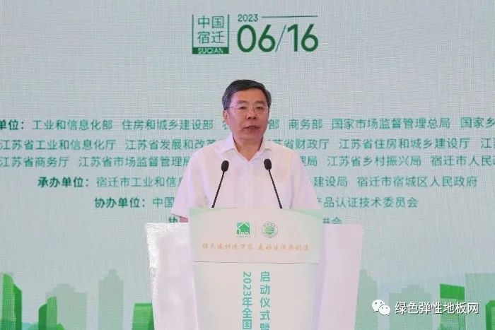 全国绿色建材下乡活动(江苏站)启动仪式现场 6月16日,以“绿色建材进万家、美好生活共创建”为主题的2023年全国绿色建材下乡活动(江苏站)启动仪式在江苏省宿迁市举行,这也是第二批绿色建材下乡活动试点地区的首场启动会。 工业和信息化部原材料工业司副司长邢涛,中国建筑材料联合会常务副会长陈国庆,江苏省工业和信息化厅二级巡视员马小平,宿迁市人民政府副市长仲小兵出席会议并讲话。国家乡村振兴局开发指导司二级调研员陈金良,中国建筑材料联合会副会长、建华建材(中国)有限公司董事长王刚,中国建筑材料联合会总经济师、副秘书长孙星寿,绿色建材产品认证技术委员会常务副秘书长牛凯征,中国建筑装饰装修材料协会副会长兼秘书长王保祥,中国国检测试控股集团股份有限公司总经理陈璐,以及江苏省、宿迁市相关部门负责人,绿色建材下乡活动线上平台京东集团负责人,相关行业协会负责人,绿色建材下乡活动参与企业,建材领域相关生产企业,认证机构、新闻媒体代表等约350人参加会议。
